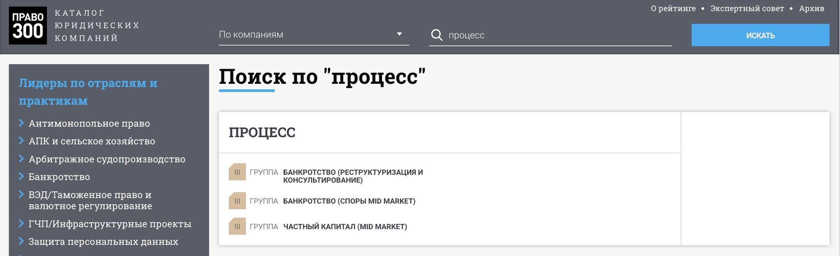 Юридическая компания Процесс впервые принимала участие в рейтинге ПРАВО-300 и была отмечена сразу в 3-х номинациях: